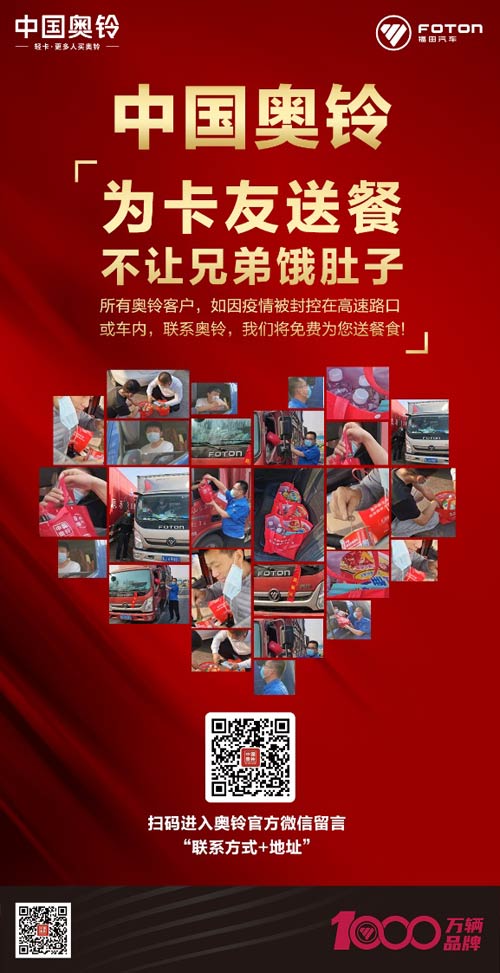 今天早晨,北汽福田奥铃事业部官方宣布:为卡友免费送餐,不让兄弟饿肚子!所有奥铃客户,如因疫情被封控在高速路口或车内,可在奥铃官方微信号留下您的联系方式及地址,他们将免费为您送餐食。