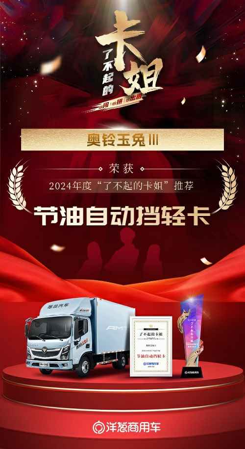 现代社会,女性在各行各业中挥洒着汗水,也为社会经济的发展做出了卓绝的贡献。3月8日,全世界迎来了第114个国际妇女节。在欢庆节日之时,由洋葱商用车网发起的第三届“了不起的卡姐”评选举行了线上颁奖活动,展示了公路货运行业中属于女性的力量。同时,活动评选并表彰了卡姐心目中的优秀产品,奥铃玉兔Ⅲ荣获2024年度“了不起的卡姐”推荐“节油自动挡轻卡”荣誉。