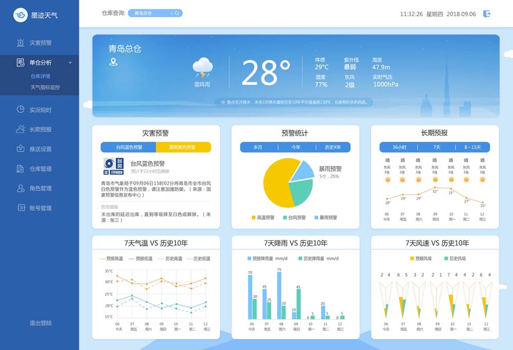 气象要素:墨迹天气可以提供温度、湿度、晴雨、风力、空气质量等基础气象预报信息,还可提供台风、高温、寒潮、雾、霾、道路结冰、雷电、霜冻等影响物流平稳运输的气象预警信息,并会根据实时气象情况给出相应的建议措施。